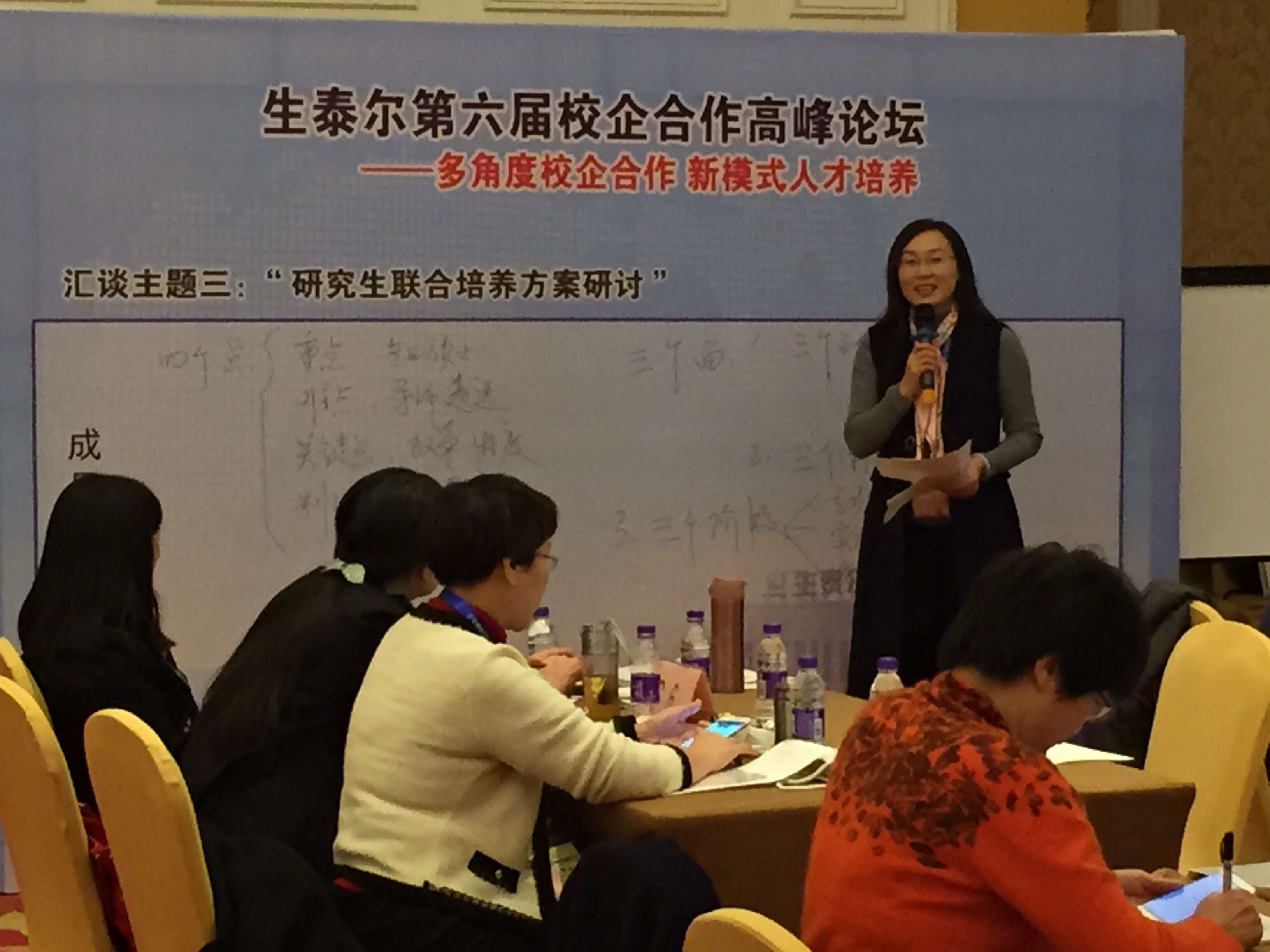 本次论坛采取的是“世界咖啡深度汇谈”法,与会代表就“基于2(3)+1”实习模式下的人才培养”、“基于'生泰尔班'的人才联合培养新模式、新方案”以及“研究生联合培养方案”三个议题开展了热烈的讨论和经验分享。杨艳秋书记作为第三议题的问题导师,向大会全体代表做了研讨成果分享并获得全体参会人员的一致好评。