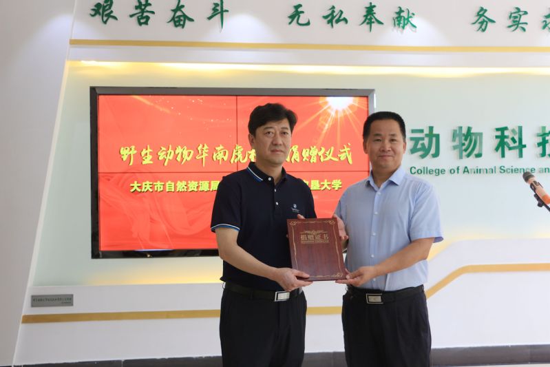 6月19日,大庆市自然资源局牛玉全局长一行向公司捐赠野生动物华南虎标本,副董事长武瑞、校资产管理处汤华成和U8国际官网全体院领导参加捐赠仪式。