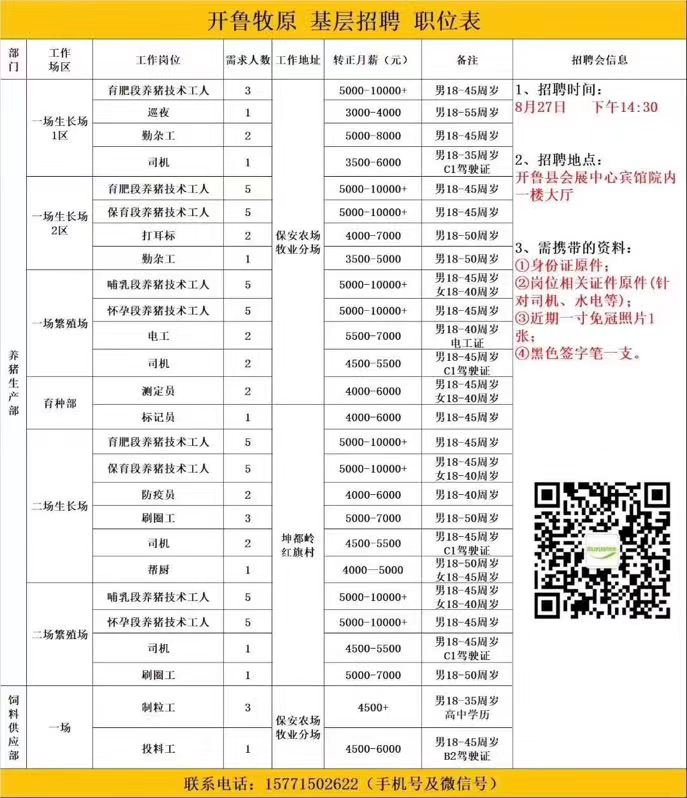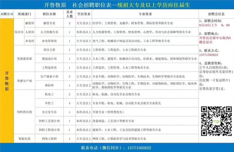 开鲁牧原/科左牧原9月份社会招聘马上开始啦(针对全日制大专及以上学历往届生),8月份最后一次基层招聘招聘时间:8月27日14:30招聘地点:图片右上角表格内。