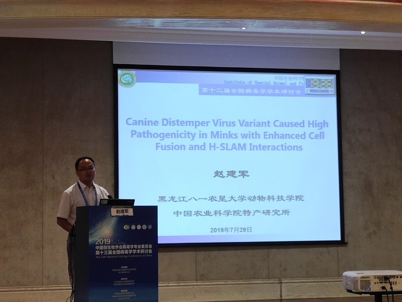 2019年7月27日至7月30日,第十三届全国病毒学研讨会在哈尔滨召开。公司经理孙东波教授、赵建军、王建发、李春秋老师及研究生参会交流。赵建军老师应邀在会上做了题目为“Canine Distemper Virus Variant Caused High Pathogenicity in Minks with Enhanced Cell Fusion and H-SLAM Interactions”的学术报告,报告介绍了我国犬瘟热病毒遗传变异现状及犬瘟热防控的最新研究成果。