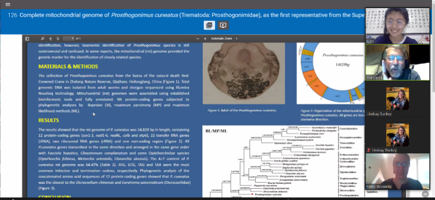 2019级硕士研究生果馨儒作了题为“Complete mitochondrial genome of Prosthogonimus cuneatus (Trematoda: Prosthogonimidae), as the first representative from the Superfamily Microphalloidea.”(Microphalloidea超科中第一个代表性成员楔形前殖吸虫线粒体全基因组特征分析)的海报讲解。