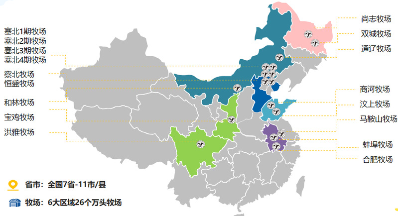集团布局:全国7省11市/县建有26个自有大规模牧场,员工近5000人。