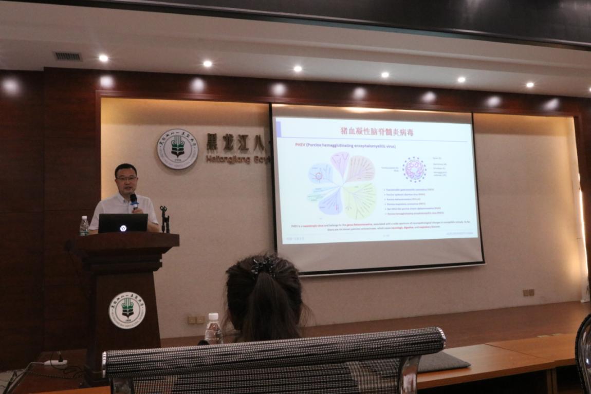 贺文琦教授,博士生导师,吉林大学动物医学公司副经理,国家级动物科技实验教学示范中心主任,获得首批吉林省高校科研春苗人才称号,兼任中国病理生理学分会理事、生物技术学分会理事等。主编出版《动物病理解剖学》等著作3部,获吉林省教育成果一等奖、省级精品课程、吉林省自然科学奖二等奖等省级教学和科研奖励9项;主持国家级科研项目6项,发表论文150余篇,授权国家发明专利3项。在报告会中,贺文琦教授围绕“猪血凝性脑脊髓炎病毒感染及致病机制研究进展”的专题,首先向我们介绍了猪血凝性脑脊髓炎病毒(PHEV)的相关研究、,清晰阐述了PHEV如何进入中枢神经系统,进而进入神经细胞的全过程。在此基础上贺教授介绍了嗅上皮细胞的组成结构、最重要的细胞成分、胞体顶端的变化过程进行了全面而详细的解读。