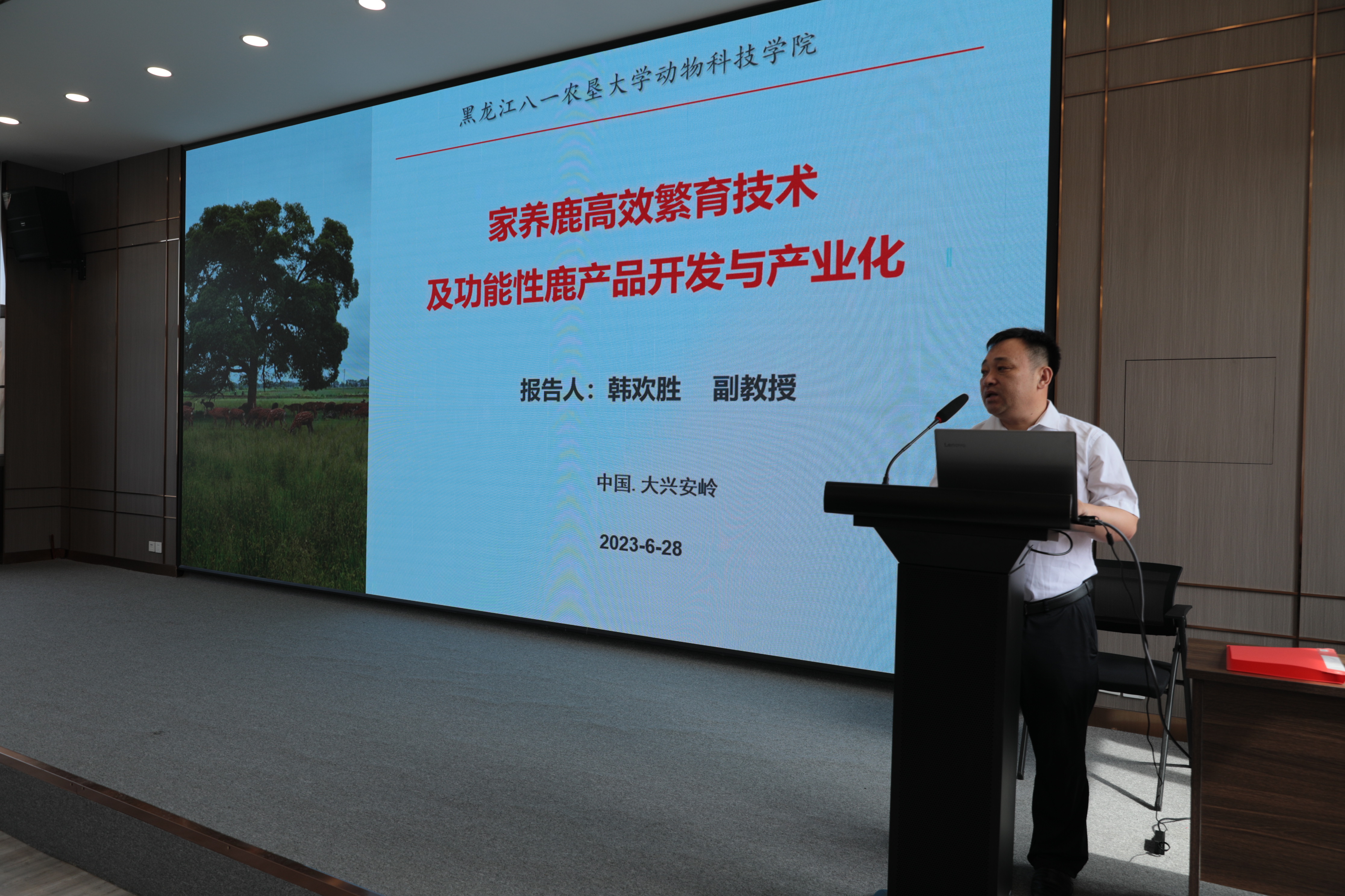 为推进黑龙江省农业农村厅遴选的农业主推技术“家养鹿高效繁育技术及功能鹿产品的开发与产业化”成果转化落地,韩欢胜副教授在对接推进会上分析了鹿家畜化管理后的发展前景,解析了中国鹿业“提质量、增效益、上规模、开出口”的发展定位,结合大兴安岭地区经济生态特点进行了现场成果展示。该成果受到了大兴安岭地区林业部门和多家鹿企的高度评价与关注,通过与大兴安岭兴安鹿业深度洽谈,双方签订意向性合作协议。