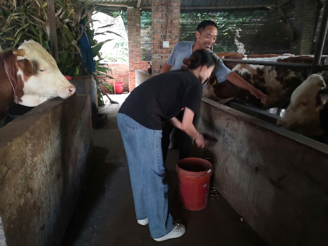 活动期间,团队成员积极走进各地牛场,在进行采访问卷调查后帮助养殖户喂牛,清扫牛舍;传授“牛腹通”的使用方法,包括粪便样本采集、加样的注意事项,并指导养殖户进行犊牛脐带消毒、静脉注射方法等常见操作技术。