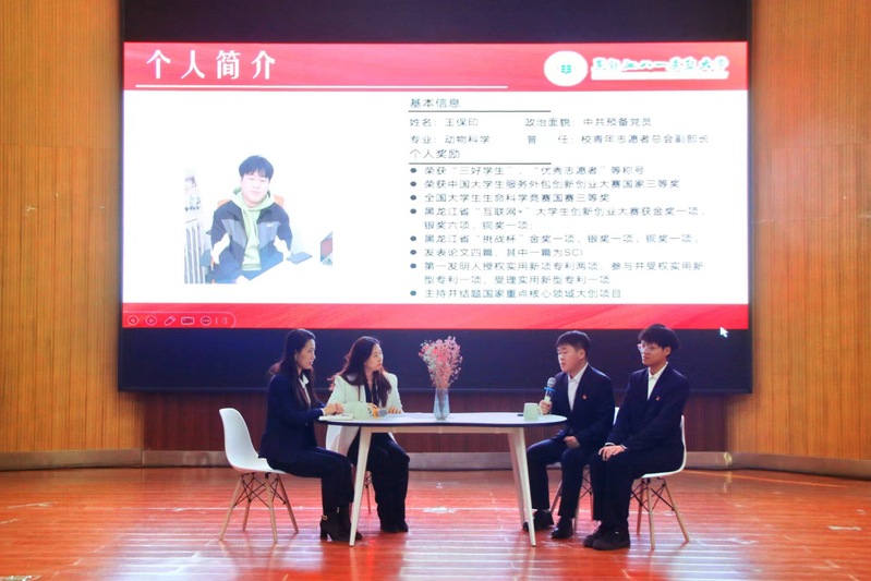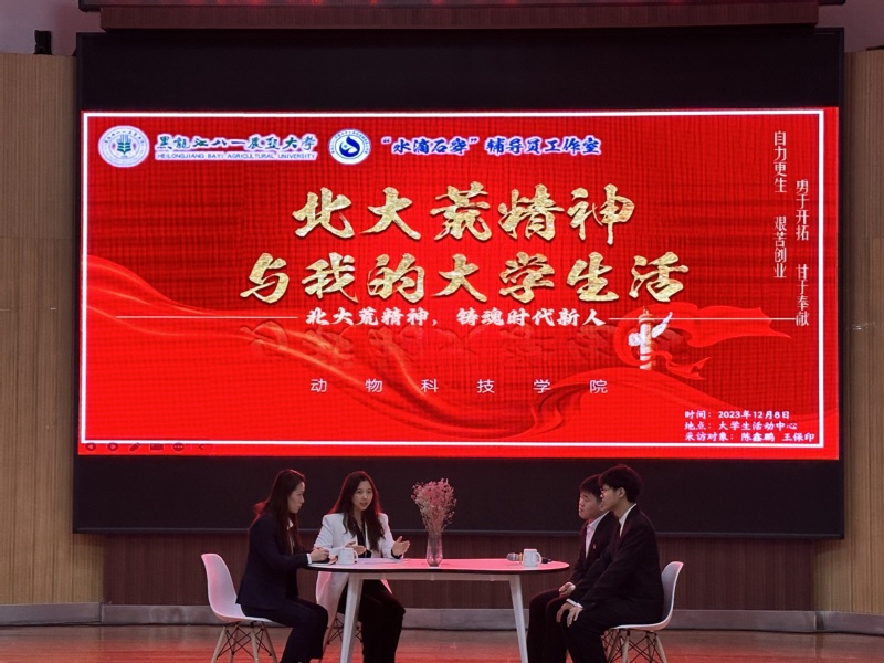 本期访谈栏目的主题是“北大荒精神与我的老员工活”,围绕对北大荒精神的认识,与北大荒精神的故事、老员工活里北大荒精神对自身的影响、北大荒精神的烙印、如何传承北大荒精神四个话题进行深入探讨和交流。活动开始,播放北大荒精神展示馆访谈视频,两位同学从对北大荒精神的认识,与北大荒精神的故事中讲述自己对于北大荒精神的理解与感悟,在北大荒精神展示馆中深切感受来自北大荒精神的力量。谈到北大荒精神对自身的影响时,陈鑫鹏分享在猪场实习的经历,王保印分享了参与乡村支教期间的经历,北大荒精神伴随他们一路走来使得他们的心境愈发坚定,面对艰苦环境,直面问题,解决困难。特邀嘉宾李嘉欣就对两位同学的了解与北大荒精神融合进行交流。在北大荒精神的烙印中,陈鑫鹏讲述了“互联网+”省赛期间的故事,王保印将自己只身代表团队参加国赛的经历生动描述,仿佛那段经历的孤独和勇敢还历历在目,参会的同学进行了现场互动交流。节目的尾声,主持人向特邀嘉宾和两位嘉宾提出作为八一农大师者和学子该如何传承北大荒精神,两位同学结合自己的老员工涯经历给予同学们对于北大荒精神独特的理解与感悟,李嘉欣老师就北大荒精神在教师和员工中发挥作用提到继承和践行北大荒精神,以文化育人。