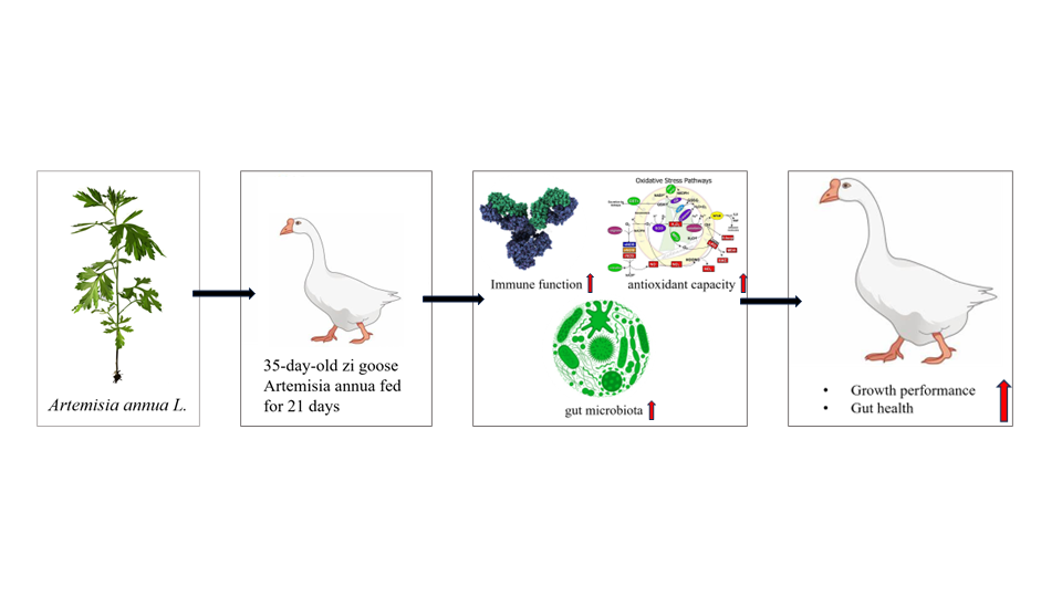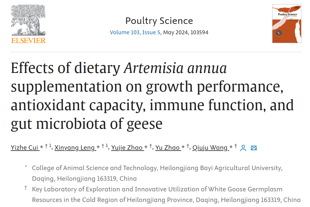 2024年3月,黑龙江省寒区白鹅种质资源发掘与创新利用重点实验室王秋菊/崔一喆团队在农林科学一区权威杂志Poultry science在线发表题为“Effects of dietary Artemisia annua supplementation on growth performance, antioxidant capacity, immune function, and gut microbiota of geese”的文章,阐述了传统天然药物青蒿对籽鹅生长性能、抗氧化能力、免疫功能和肠道菌群的影响。