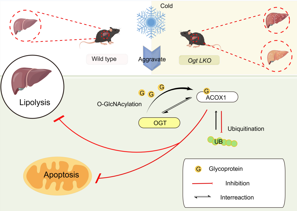 该研究表明,过量的饮食脂肪通过刺激非脂肪组织中过量的脂肪沉积而导致肥胖和代谢综合征,并最终发展为非酒精性脂肪性肝炎(NAFLD)。目前还没有直接治疗NAFLD的特定药物,通常可以通过采取措施改善生活方式、减肥和改善胰岛素抵抗来缓解NAFLD。OGT通过与ACOX1相互作用,调控ACOX1的O-GlcNAcylation,从而抑制ACOX1在K48位点的泛素化降解过程,进一步促进肝脂解。这些研究结果为理解寒冷诱导的肝脏脂代谢变化的机制提供了理论基础,也为进一步调节肝脏脂质代谢和非酒精性脂肪肝、高脂血症、肥胖等症状的治疗提供了潜在的靶点。