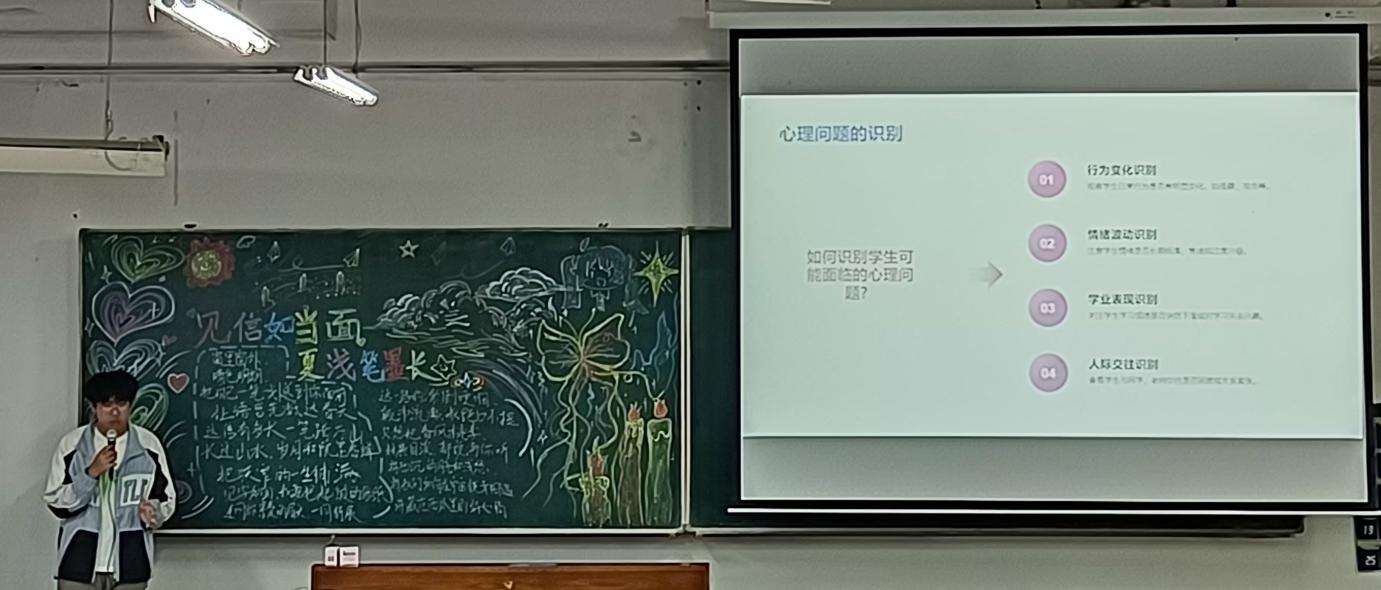 主持人曲宏博为同学们介绍了心理健康的相关信息,从心理压力的来源、心理健康的重要性以及如何在快节奏社会中保持心理平衡的方法等方面进行了详细的讲解。在主持人的引导下,同学们纷纷敞开心扉,分享自己在生活中产生的不良情绪以及化解的办法。