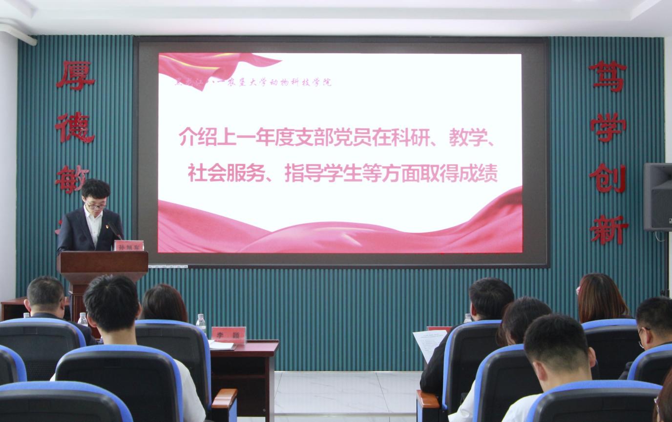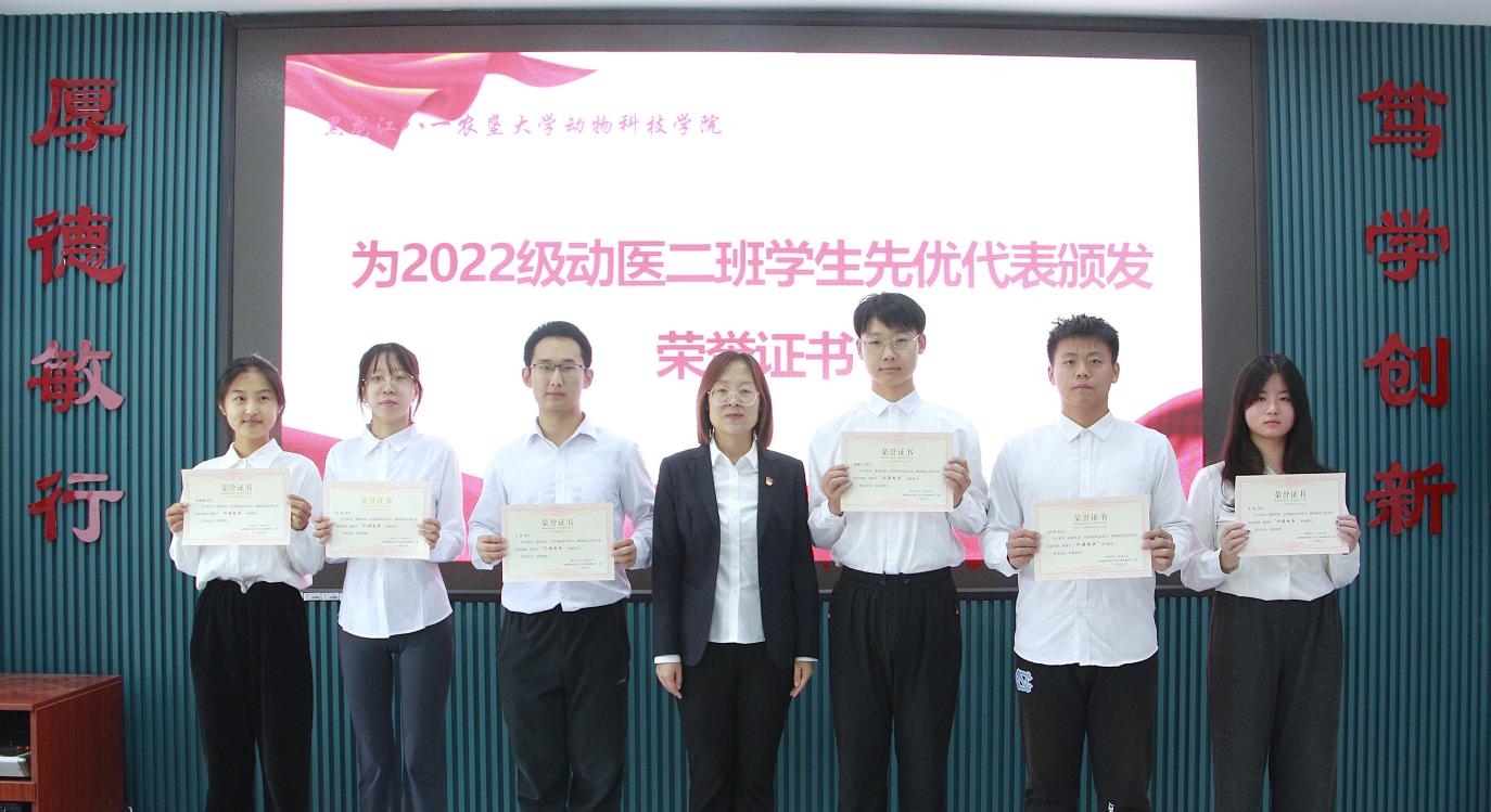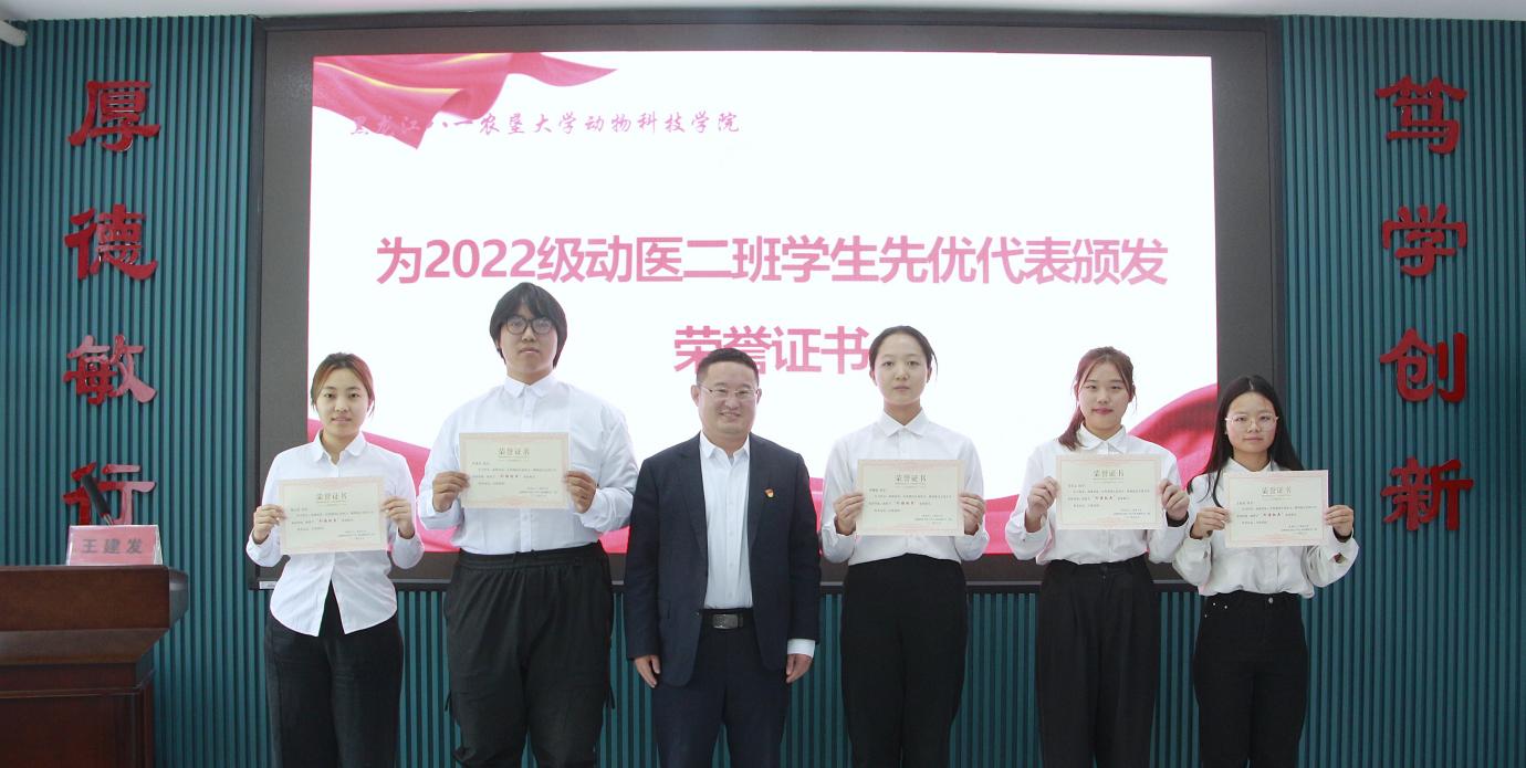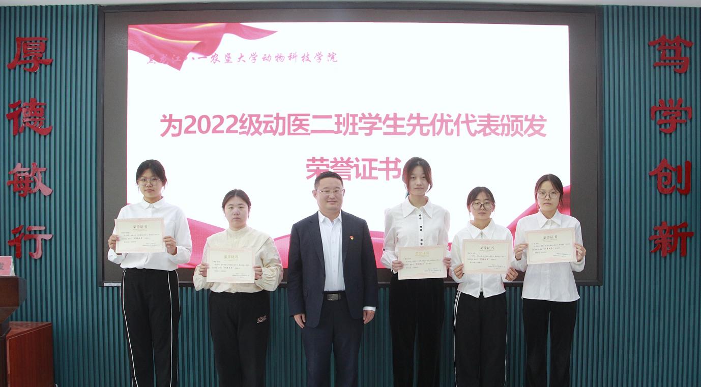 支部党员杨丹、宋玉溪、2022级动物医学2班马仪文、张馨聪分别结合工作和学习实际,交流了学习体会。孙旭东介绍了上一年度支部党员在科研、教学、社会服务、指导员工等方面取得的成绩,2022级动医2班班主任王建发介绍了上一年度班级员工在外语四六级考试、学习、班级建设等方面取得的成绩,与会领导分别为班级通过外语四、六级的“外语学习标兵”、综合测评和纯成绩前3名的“学习标兵”、党支部“科研标兵”“教学标兵”和“社会服务标兵”颁发荣誉证书。