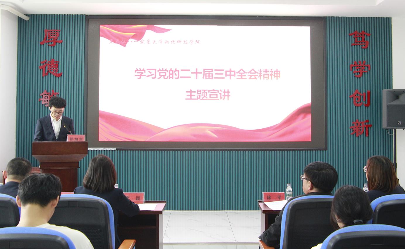 孙旭东作了党的二十届三中全会精神主题宣讲,解读了二十届三中全会精神和重大意义,分析了在新时代背景下,畜牧行业的重要性和面临的挑战,并分析了高校教师面临的机遇和挑战以及未来的努力方向。