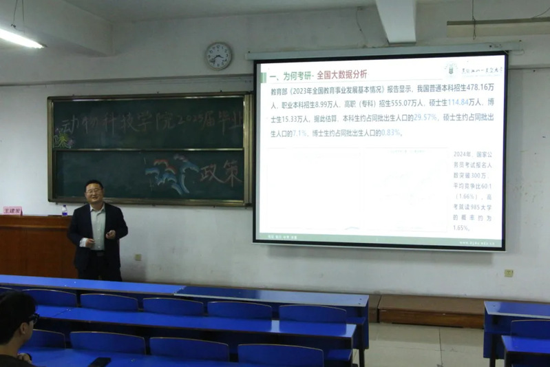 会上,王建发从考研动机、考研形势、报考院校选择三个方面展开讲解。他表示,希望同学们树立正确的考研动机,理性考研,未来通过研究生阶段的学习,深入钻研专业知识,提升自身学术水平,为职业发展打下坚实的基础。分析了当前全国考研形式,介绍了公司历年考研数据,鼓励同学们要充分利用时间,制定科学合理学习计划,进行系统复习,以饱满的热情和坚定的信念投入到考研复习中。会上针对公司刚刚发布的《2025年硕士研究生招生简章》进行了解读和答疑。