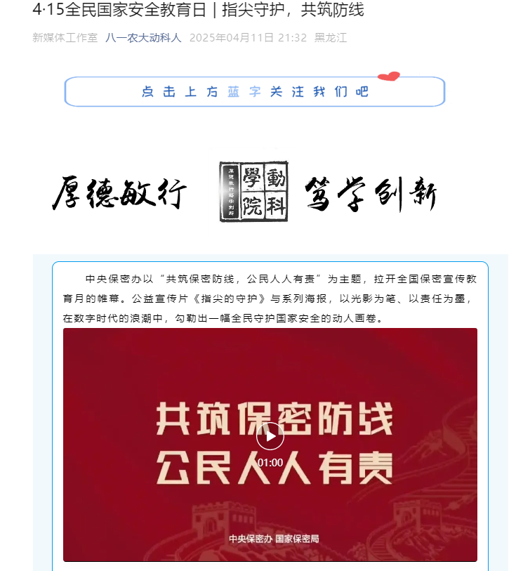 公司充分发挥校园宣传阵地作用,通过“线上+线下”双渠道宣传国家安全知识,线上在公司公众号推送国家安全知识科普,线下在公司电子屏循环播放国家安全主题海报和宣传标语,全方位、多角度覆盖全院师生,为全院师生筑牢国家安全思想根基。